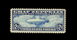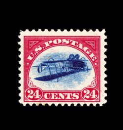 290 og C3a image#C3a, 24c Carmine rose and blue, Center Inverted, position 69, wonderfully bright and fresh, deep rich colors, well centered, especially clean full o.g., lightly hinged, extremely fine. The 1919 Twenty Four Cent Inverted Jenny is one most recognized and desired rarities in all of philately. Its legendary status began the moment the stamp was issued in May 1918, when William T. Robey purchased an entire error sheet of 100 at the New York Avenue Post Office window in Washington D.C. - just one day after the stamp was issued - May 14th. Within one week Robey sold the sheet for $15,000.00 to the well-known Philadelphia stamp dealer Eugene Klein (an impressive return on his initial $24.00 investment). Shortly thereafter Mr. Klein sold the sheet to the renowned, yet eccentric collector, Col. Edward H.R. Green for $20,000.00. Col. Green asked Klein to break up the sheet for him into singles and blocks, and instructed him to sell all but the few key position blocks. What is puzzling is how, given the immediate attention created by a spectacular new error, so many of the stamps from the sheet have been poorly handled and stored over the years. In fact, there are at least seven examples whose whereabouts are unknown and presumably lost to philately. A great many of the known copies have varying degrees of faults and some even have lost their original gum. Improper hinging has caused a significant number of the faults, often thinning or creasing the stamps. That is why it is a rare occasion when a truly choice example makes an appearance on the auction market. Just such an occasion commands special attention among collectors who wish to acquire a select example of one of the most recognized and important rarities in philately. The example from the McKinney collection is one of the very few existing Inverted Jennys to combine overall freshness, outstanding colors, excellent centering, and preservation of its original gum on a single copy. Accompanied by a 1970 PF certificate. (Image) 170,000.00