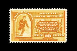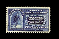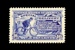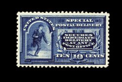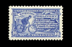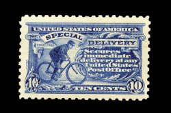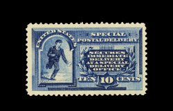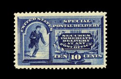 298 nh E9 image#E9, 10c Ultramarine, a gem mint example of this scarce special delivery, incredibly well centered within lavishly large margins, strong rich color and a deeply etched impression, o.g., n.h., extremely fine; a remarkably choice stamp; 1996 PF certificate. (Image) 340.00