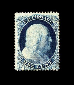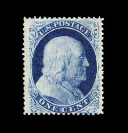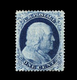 25 ng 21 image#21, 1c Blue, Ty. III, position 16L4, an exceptionally bright and fresh unused example of this very rare and notoriously difficult stamp, possessing sumptuously rich color and a well incised impression on immaculate paper, extraordinarily well centered as well, particularly when compared to the small existing population of mint/unused examples, traces of o.g., a very fine and choice example of a stamp that is on virtually every serious collector's want list; cataloged as unused, an original gum example catalogs $12,000.00; 1995 PF certificate. (Image) 6,000.00