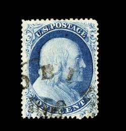 23 O 19 image#19, 1c Blue, Ty. Ia, position 92R4, highly select used example of this rare and enormously challenging stamp to find in any kind of collectable quality, boasting outstanding centering amid far larger margins than typically associated with this, in fact its design nearly clears the perforations all around which is a very rare occurrence, rich luxuriant color and a clean well defined impression so that the Type Ia characteristics show clearly, neat and unobtrusive town c.d.s., extremely fine for this; a rare opportunity to acquire an elusive stamp in premium quality; 1998 PF certificate. (Image) 6,500.00