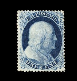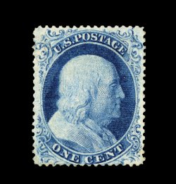 26 og 22 image#22, 1c Blue, Ty. IIIa, a remarkably choice mint example that is in a quality far superior to the vast majority, possessing outstanding centering amid lavishly large margins which are almost unheard of on this stamp, plus it boasts on overall freshness, with striking deep blue color and a deeply etched impression, even its reverse is out of the ordinary sporting full clean o.g. that has been only lightly hinged, extremely fine; a gem original gum One Cent perforated Type IIIa; clearly among the finest we have ever had the pleasure to offer; 1988 PF certificate. (Image) 1,900.00