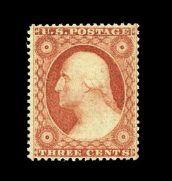 31 og 27 image#27, 5c Brick red, Ty. I, incredibly fresh, sumptuously rich and unmistakable brick red color, strong detailed impression, well centered with the perforations on three sides being well clear and just barely touching at left, full original gum that has been relatively lightly hinged, tiny natural inclusion speck mentioned for complete accuracy only, very fine and exceedingly choice. Any certified original gum example of the 1857 Five Cent Brick Red is an enormous rarity, as this stamp ranks among the most elusive in all of United States philately to find both sound and with original gum. In fact, we estimate that there may be no more than two dozen such examples in existence, with nearly two thirds of this select group having varying degrees of faults. This leaves less than ten sound original gum examples available and we can find no famous name collection which contained a finer example than the one offered here. The reality is that most of the important name collectors of mint U.S. stamps over the past 50 years or so lacked this stamp, as they never encountered an opportunity to acquire such a stamp during their collecting lifetime. Today's serious collectors of original gum United States stamps will certainly recognize the offering of the McKinney example as one of their few chances literally in a lifetime to acquire one of the key mint rarities of United States philately. The last appearance of this stamp at public auction in June 1999 (Robert A. Siegel Auction Galleries, Inc., Sale #812) resulted in a record realization of $35,000.00, plus the 10% buyer's premium, after highly competitive bidding. We fully expect that its appearance here will again attract spirited bidding and will result in another impressive realization. Accompanied by a 1978 PF certificate. ex-Golin. (Image) 25,000.00