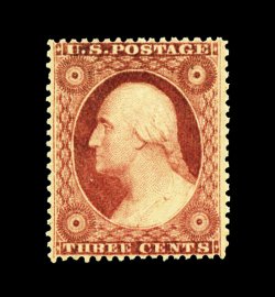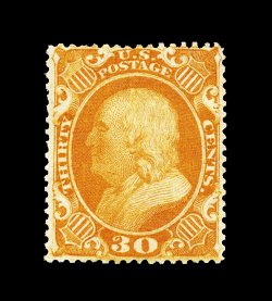40 og 38 image#38, 30c Orange, an especially handsome and select mint example of this difficult value, possessing several exceptional physical attributes, not the least of which is its incredibly intense color that is completely unaffected by oxidization as is so often the case, plus its impression is far more deep than usual, equally impressive is this stamp's outstanding centering, full clean o.g., lightly hinged, extremely fine; a gem original gum example of the Thirty Cent 1857 issue; 1995 PF certificate. (Image) 1,800.00