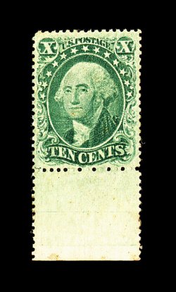 34 og 31 image#31, 10c Green, Ty. I, position 100R1, an incomparable bottom sheet-margin mint single, possessing essentially perfect centering amid uncharacteristically large margins, brilliantly fresh, with rich vibrant color and a clean crisp impression on bright paper, uniformly even and intact perforations all around, full original gum, lightly hinged, superb. The enormous rarity of the 1857 Ten Cent Green Type I in mint condition, particularly with original gum, cannot be overstated. To find one offered at auction in any condition happens probably no more than one or twice a year (if that "frequent"). To find one in the spectacular quality offered here is an occasion that easily qualifies as a once-in-a-lifetime occurrence. In fact, this stamp as a single has never been offered at auction before, as it has always been part of a larger multiple that was broken up to yield what is, without question, the finest mint Scott #31 in existence. The only mint example that comes close to the quality of the McKinney copy was sold in our May 1998 sale of the Eliot H. Weisman collection of United States stamps. His example, also a bottom sheet-margin copy, was quite fresh and retained its original gum. While the Weisman example was very well centered it did not possess the superb centering that this stamp boasts. It realized $28,000.00, plus the 10% buyer's premium, versus its then current catalog value of $12,000.00. It is not unreasonable to expect that the McKinney example will shatter the Weisman realization - and deservedly so. Accompanied by a 2000 PF certificate. (Image) 16,500.00