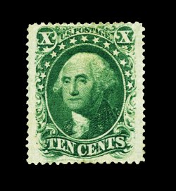 35 og 33 image#33, 10c Green, Ty. III, an extraordinarily rare and highly select mint example of a stamp that is often missing in even the most advanced collections of mint United States stamps, possessing a marvelous overall mint "bloom" which belies its age, with truly prooflike color and impression on fresh crisp paper, exceptionally well centered as well, with uncharacteristically large margins, full immaculate o.g. that has been only very lightly hinged, extremely fine considering its overall physical attributes; among the finest original gum 1857 Ten Cent Type III stamps available; 1999 PF certificate. (Image) 5,000.00