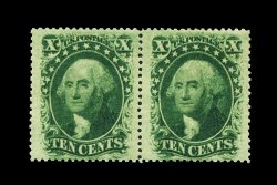 37 og 35, 35 var. image#35, 35 var., 10c Green, Ty. V, curl in forehead variety, pristine mint horizontal pair, with the right stamp (position 78L2) displaying the distinctive "curl in forehead" variety, incredibly intense color and impression, excellent centering within very wide margins, immaculate full o.g. that has been very lightly hinged, extremely fine; an especially choice and desirable position piece for the specialist; 1989 PF certificate for a block of nine from which this pair was taken. (Image) 600.00+