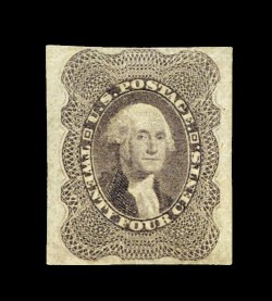 39 og 37c image#37c, 24c Lilac, imperforate, unused, without gum as always, four ample to large margins, rich color, small corner crease at top left which is truly inconsequential, otherwise very fine for this rare imperforate variety; 1994 PF certificate. (Image) 1,500.00