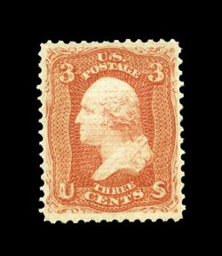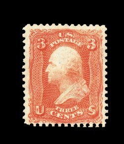 62 og 74 image#74, 3c Scarlet, a magnificently fresh mint example of this trial printing rarity, being one of the few existing examples that is both sound and still retaining its original gum, boasting an incredible overall brilliance that few others enjoy, with absolutely radiant color and a razor-sharp impression, while centered slightly to bottom this particular example is far better centered than most, pristine full o.g. that has been only lightly hinged, very fine and exceedingly choice; very few examples of the Three Cent Scarlet exist, whether mint or "used" with the characteristic pen stroke cancels, and you can probably count on less than two hands the number of examples that exist mint both with original gum and in sound condition; 1998 PSE certificate. (Image) 7,000.00