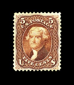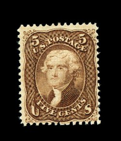 63 og 75 image#75, 5c Red brown, an extraordinary quality mint example of an exceedingly difficult and challenging stamp to find in any kind of collectable quality (especially with original gum), with this particular example possessing exceptional physical attributes that are seldom associated with this stamp, including being wonderfully well centered within large margins, plus its color is rich and luxuriant, and its impression strong on bright fresh paper, full o.g., lightly hinged, extremely fine; a true condition rarity; 1969 and 1996 PF certificates; ex-Anderson. (Image) 4,500.00
