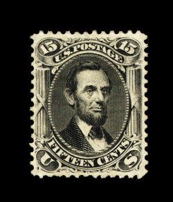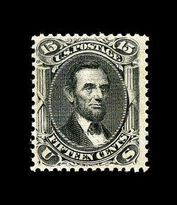 64 og 77 image#77, 15c Black, exceptional quality mint example of this impossibly difficult stamp, featuring a marvelous overall freshness, with intense color and a razor-sharp impression on crisp paper, wonderfully well centered and margined, especially when compared to most which are found quite off center, full o.g., lightly hinged, extremely fine for this; far more rare in this premium quality original gum condition than most collectors and dealers realize; 1999 PF certificate. (Image) 1,750.00