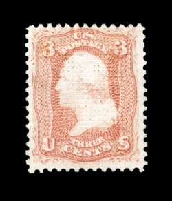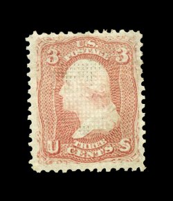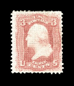 66 og 79 image#79, 3c Rose, "A" grill, a very rare premium quality mint example of this notoriously difficult stamp, being among a select few existing examples that is both sound and still retaining its full original gum, wonderfully fresh, rich luxuriant color and a far stronger impression than usual on uncommonly bright paper, well centered, far more intact perforations than typically encountered, full clean o.g., lightly hinged, very fine and choice; the Scott catalog value quoted is for "fine-very fine copies with minor perf. faults"; 1983 and 1995 PF certificates. (Image) 5,000.00
