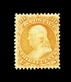 82 og 100 image#100, 30c Orange, "F" grill, a very rare mint example of this terribly difficult value, being in a much fresher state of preservation than almost any other we have seen, with gorgeous vibrant color and a strong detailed impression on crisp paper, quite well centered, especially when compared to the vast majority, full clean o.g., relatively lightly hinged, very fine; a condition rarity as this stamp is almost never found with original gum in any condition, let alone in this pristine state; 1993 PF certificate. (Image) 5,500.00