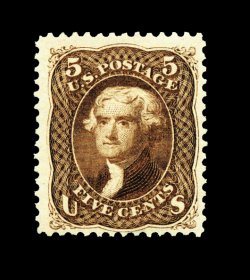 87 og 105 image#105, 5c Brown re-issue, well centered within impressively large margins which are most uncharacteristic, luxuriously rich color and a deeply etched impression on bright paper, full clean o.g. which has been only very lightly hinged, a very fine and choice example of this rare stamp; only 672 issued; 1959 PF certificate. (Image) 2,750.00