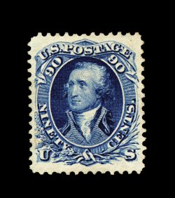 83 og 101 image#101, 90c Blue, "F" grill, an extraordinarily rare offering of a mint example of this elusive and difficult stamp, being one of just a few certified original gum examples extant, possessing a marvelous overall freshness, with sumptuously rich color and an excellent clarity of impression on bright crisp paper, quite well centered within large margins, especially clean full o.g. which shows the grill impression superbly, lightly hinged, very fine and exceedingly choice; an enormously rare mint stamp that is missing in virtually every mint collection, no matter how comprehensive, for example even the impressive collections formed by Messrs. Weisman, Zoellner, Lyons, Floyd and Lessin did not have a single example of an original gum Ninety Cent "F' Grill; 1999 PF certificate. (Image) 10,000.00