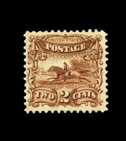 97 og 118 image#118, 15c Brown and blue, Ty. I, a fabulously fresh and choice mint single of this impossibly difficult stamp, being in a quality which is far superior to the vast majority of existing mint examples, possessing spectacularly brilliant colors and impressions that are truly prooflike, also this stamp features exceptional centering and margins, even its reverse is outstanding, featuring full clean o.g. that has been relatively lightly hinged, considering how preciously few mint examples of #118 are found in premium quality, this stamp is deserving of the extremely fine grade; one of the finest original gum Fifteen Cent Type I 1869 Pictorials to be offered at auction in quite some time; 1998 PF certificate. (Image) 7,500.00