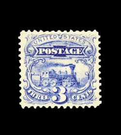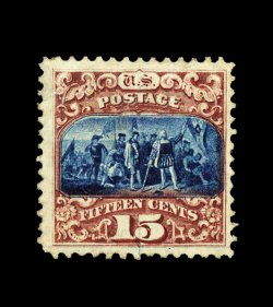 100 og 121 image#121, 30c Blue and carmine, a brilliantly fresh and choice example of this rare mint stamp, possessing a marvelous overall brilliance few other known mint examples can boast, with truly prooflike colors and impressions on immaculate paper, quite well centered within large margins, full clean o.g., lightly hinged, very fine; an exceedingly handsome and desirable stamp; very few select quality Thirty Cent 1869 Pictorials exist still retaining their full original gum; 1996 PF certificate. (Image) 7,000.00
