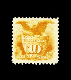 96 og 116 image#116, 10c Yellow, incredibly fresh mint example, featuring absolutely gorgeous intense color that is far more deep than usual, plus its impression is especially well detailed on bright paper, well centered, full o.g., very fine; an especially choice original gum Ten Cent 1869 Pictorial; 1998 PF certificate. (Image) 2,000.00
