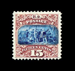 98 og 119 image#119, 15c Brown and blue, Ty. II, intensely rich colors and strong detailed impressions, well centered amid extravagantly large margins which are most uncharacteristic of this value, slightly disturbed part o.g., very fine; an impressively large-margined example of this rare mint stamp. (Image) 3,250.00