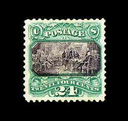 99 og 120 image#120, 24c Green and violet, an incredibly choice and desirable mint example of this rare stamp, being in a condition that is quite uncharacteristic of most known examples, possessing wonderfully rich colors and with razor-sharp impressions on bright paper, wonderfully centered as well, with much larger margins than typically encountered, full o.g., relatively lightly hinged, extremely fine; a terribly difficult stamp to obtain in sound unused condition, let alone with full original gum and in premium quality; a stamp that is missing in even the most advanced collections of mint United States stamps; 1984 and 1997 PF certificates. (Image) 7,000.00