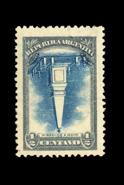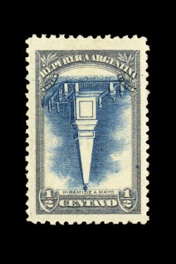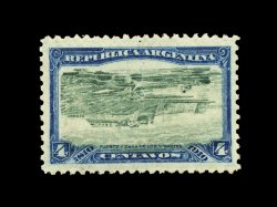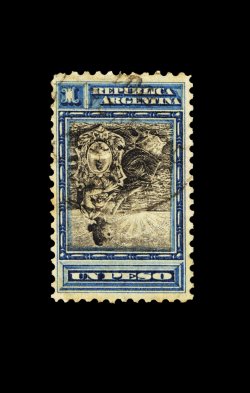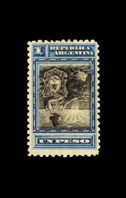 404 ogbl 139a image#139a, 1899 1P Blue and black, Center Inverted, a showpiece top right corner partial imprint and control no. 00079 margin block of six, deep rich colors, full original gum that has just been faintly hinged on a few stamps, light pencil signatures on gum, very fine; this is believed to be the largest known multiple of this error as well as being one of the most spectacular inverted center multiples from Argentina. (Image) 9,000.00+