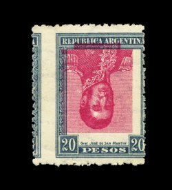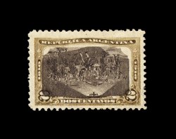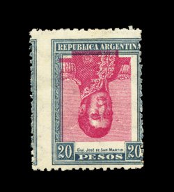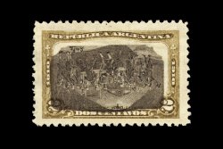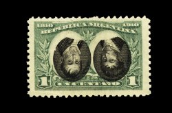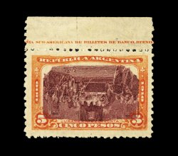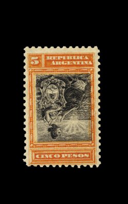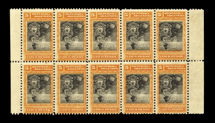 407 og/nhbl 140a image#140a, 1899 5p Orange and black, Center Inverted, a magnificent mint block of ten (5x2) showing sheet selvage at both sides, rich colors, full original gum, about half the stamps never hinged, fine; not only is this the largest known multiple of this error, but it is also one of the great rarities in Argentine philately and certainly the most important showpiece from the 1899 Issue. (Image) 27,500.00+