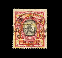 419 O 48 var. image#48 var., 1919 10R with handstamp in black, basic Russian stamp (#109d) with Background Inverted, clear Erivan 2.5.1920 c.d.s., very fine; this is the only known example of this error and was only discovered in the last decade, the basic Russian stamp with the background inverted (#109d) in itself is a very scarce item, so it is unlikely that another example with the Armenian handstamp will be found; not yet listed in Scott or Michel; 1994 Mikulski certificate (Michel #19 var.). (Image) Est. 1,500-2,000