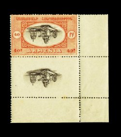 420 nh Yv 98 var imageYvert #98 var., 1920 40R Orange and black, Center Inverted, bottom right corner margin pair, the top stamp with inverted center, the bottom stamp with inverted center and no frame, o.g., n.h., fine; a most striking and unusual se-tenant error pair. (Image) Est. 100-150