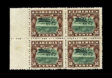 602 ogbl O67a var image#O67a var., 1909 50c Brown and green official, Center Inverted and with overprint omitted, left margin block of four, deep colors, o.g., lightly hinged, very fine. (Image) Est. 200-300