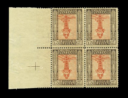 603 nhbl 22b-25a image#22b-25a, 1921 5c, 10c, 15c and 25c Pictorials, Centers Inverted, each a right or left sheet-margin block of four with guide line in selvage, o.g., n.h., fine-very fine (Sassone #23c-26c; for hinged L3,400,000+). (Image) for hinged 638.00+