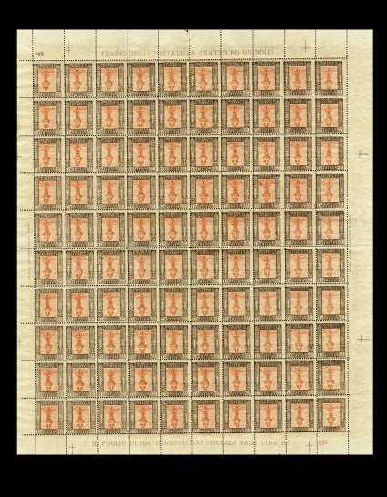 604 nhbl 22b-25a image#22b-25a, 1921 5c, 10c, 15c and 25c Pictorials, Centers Inverted, in full sheets of 100, each sheet folded vertically in the middle, some very minor perf. separations and a few minor toning specks, still quite fresh, o.g., n.h., fine-very fine; probably a unique set of these spectacular sheets (Sassone #23c-26c; for hinged L97,500,000+). (Image) for hinged 15,950.00+