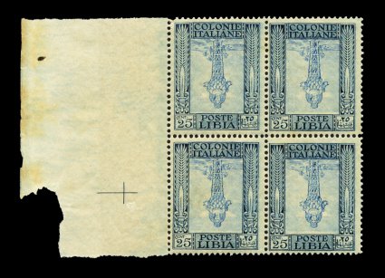607 nhbl 53a image#53a, 1924 25c Blue and dark blue, Center Inverted, left sheet-margin block of four with guide line in selvage, rich colors, clean fresh o.g., n.h., fine-very fine (Sassone #49c; for hinged L1,600,000). (Image) for hinged 440.00+