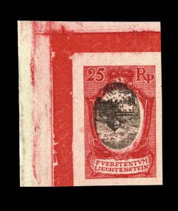 609 P 63 var image#63 var., 1921 25 Rose red and black plate proof, Center Inverted, top left corner sheet-margin single, being pos. 1 from the sheet, deep colors, extremely fine; a very rare and handsome showpiece; signed Reinhardt BPP and accompanied by his 1987 certificate (Michel #54 var.). (Image) Est. 500-750