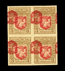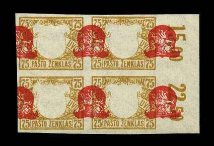 612 og/nhbl 57 var image#57 var., 1919 75k Bister and red, Center Inverted, right margin control number blocks of four of both the perforated and imperforate varieties, with center misplaced as usual, o.g., two stamps in each block n.h., very fine (Michel #57 var.). (Image) Est. 100-150