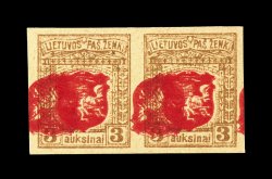 611 P 38 var image#38P var., 1919 3Auk Bister brown and rose plate proof, Triple Center, Two Inverted, the two inverted centers misplaced on the stamps, horizontal pair, large margins, choice very fine; a very scarce variety (Michel #38 var.). (Image) Est. 100-150