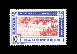 616 og C11a image#C11a, 1940 10Fr Ultramarine and red air post, Center Inverted, an especially bright and fresh example of this very scarce error, being one of the few legitimately issued inverted centers from the French Colonies, gorgeous vibrant colors on pristine white paper, o.g., lightly hinged, very fine; only one sheet of 50 was printed; signed Roumet (Yvert #15a; FF 6,500). (Image) 650.00