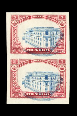 620 og 514a var image#514a var., 1916 5P Claret and ultramarine imperforate, Center Inverted, vertical pair, strong rich colors, very large margins all around, o.g., top stamp h.r., bottom stamp n.h. with owner's handstamp, extremely fine; very scarce, especially in this premium quality. (Image) Est. 400-500
