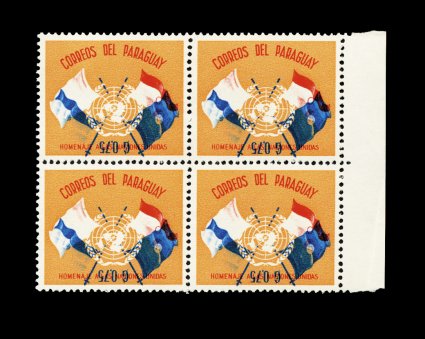 644 nhbl 570 var image#570 var., 1960 75c United Nations, Denomination Inverted, also printed on the orange background used for the air post stamp (#C272), right sheet-margin block of four, o.g., n.h., very fine; only 100 printed, so few blocks exist. (Image) Est. 500-750