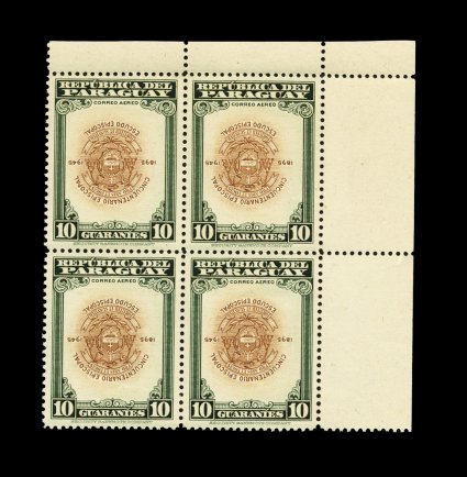 646 og/nhbl C175 var. image#C175 var., 1948 10G Coat of Arms air post, Center Inverted, top right corner margin block of four, strong colors, o.g., top stamps n.h., very fine; only a couple blocks exist from the original find of 25 stamps. (Image) Est. 3,000-4,000