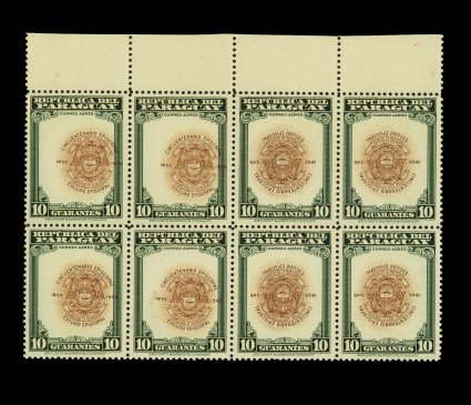 647 nhbl C175 var. image#C175 var., 1948 10G Coat of Arms air post, Center Inverted, block of four errors contained in a top sheet-margin block of eight, the right block being the inverted centers while the left block has four normal stamps, the "normal" stamps have the center shifted to the right, o.g., n.h., very fine; an eye-catching showpiece which is probably unique in this "tete-beche" format. (Image) Est. 4,000-5,000