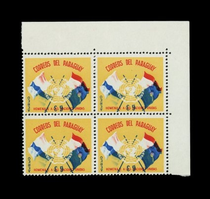 648 nhbl C272 var image#C272 var., 1960 3G United Nations air post, Blue Denomination Inverted, top right corner sheet-margin block of four, very fresh, o.g., n.h., very fine; only 50 were printed, so very few blocks still exist. (Image) Est. 750-1,000