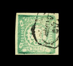 649 O 14a image#14a, 1868 1d Green, Embossed Arms Inverted, used, four large margins, strong color and impression, very fine and handsome; a very rare stamp in any condition, but to find a four-margin sound example such as this is particularly difficult; 2000 APS certificate (Michel #15F; DM 2,200). (Image) 700.00