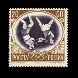 652 og 751a image#751a, 1956 20g Olympics, Center Inverted, centered to the top left as are all known examples, fresh colors, o.g., very lightly hinged, fine; only 14 examples are known to exist; signed Dr. Kronenberg and accompanied by his 1986 certificate; listed but unpriced in Scott (Michel #985K). (Image) Michel Euro €1,500