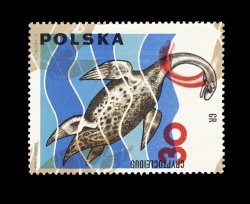653 nh 1308 var image#1308 var., 1965 30g Cryptocleidus, Red and Light Brown Colors Inverted, creating quite a striking error, o.g., n.h., very fine; only one sheet was printed and very few of these have found their way onto the auction block; one of the important modern errors of Europe, not to mention an exciting addition to a serious Dinosaur topical collection; signed E. Krawczyk (Michel #1571 var.). (Image) Est. 1,000-1,500