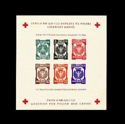 655 nh imageDachau-Allach 1945 Red Cross souvenir sheet of six, top left stamp (25pf) Inverted, two souvenir sheets, one imperforate and the other perforated, o.g., n.h., very fine; a rarely encountered error. (Image) Est. 200-300