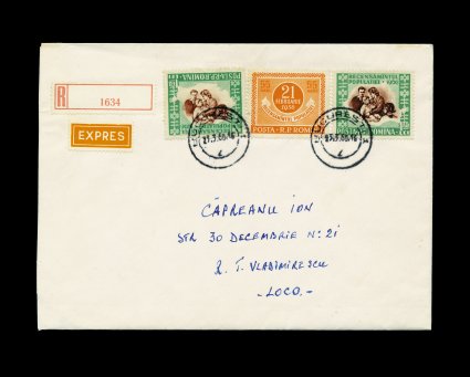 658 c 1081a image#1081a, 1956 1.75L Census, Center Inverted, tied to March 23, 1960 registered cover by Bucharest c.d.s. along with normal set (#1080-81), slightly reduced at left, backstamped, very fine; actually a rarity on cover (Michel #1564I). (Image) Est. 300-400