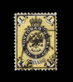 659 O 19d image#19d, 1866 1k Black and yellow, Groundwork Inverted, well centered, fresh colors, neat c.d.s. pmk., very fine; only one sheet was printed and many were used and never recovered, leaving very few examples available today; signed Faberge and accompanied by a 2000 APS certificate; ex-Liphshutz (Michel #18xI; €3,600). (Image) 1,500.00