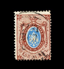 660 O 23b image#23b, 1866 10k Brown and blue, Center Inverted, centered to the bottom right as are all known examples, fresh colors, light "Kursk 2 Nov. 1874" c.d.s., slightly weak corner perf. at top right and slightly rounded corner at bottom left, both insignificant considering this stamp's rarity status, fine; one of the rarest of all the inverted centers of Russia, with only a few examples known; this particular copy has graced some of the most important Russian collections of all time including Goss, Baughman and Isleham; 1995 Mikulski certificate (Michel #21xI; €25,000). (Image) 7,000.00
