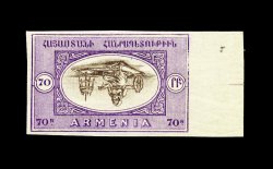 423 ngbl Yv 100 var Yvert #100 var., 1920 70R Violet and brown imperforate, Center Inverted, a complete unused sheet of 50, strong rich colors on fresh white paper, horizontal fold in middle, a few negligible edge flaws affecting the selvage only, stamps are very fine; quite likely unique as a full sheet. Est. 1,000-1,500