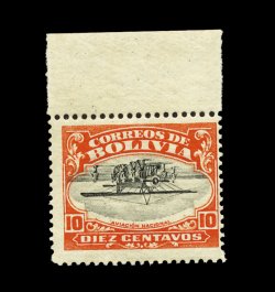 432 og C1a image#C1a, 1924 10c Vermilion and black air post, Center Inverted, top sheet-margin single, centered to right (virtually all examples of this error are centered to one side or the other), fresh colors, o.g., lightly hinged, fine; a rare airmail, as only 50 were printed; signed Sanabria and accompanied by a 1995 APS certificate (Michel #130MK; DM 5,000). (Image) 800.00