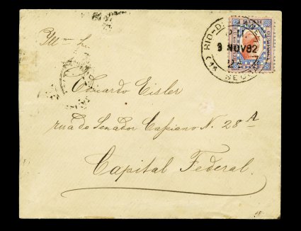 436 ogOc 109a image#109a, 1891 100r Blue and red, Head Inverted, specialized group of two mint, three used (two tied to piece) and two on cover, the off-cover stamps each with a different perforation size, plus some different shades, the covers are both commercial usages from Rio de Janiero in 1892 (one with faulty stamp), o.g., one mint stamp with sealed tear, otherwise a fine lot (Michel #97ak, 97bk). (Image) Est. 500-750+